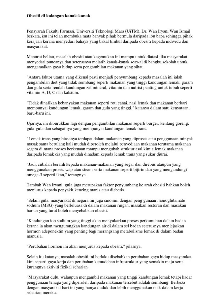 Karangan Tentang Obesiti Dalam Kalangan Kanak-Kanak - Obesiti Punca Kesan Dan Cara Mengatasinya. Punca berlakunya masalah obesiti dalam kalangan remaja. Contoh karangan punca punca obesiti dalam kalangan remaja. Beberapa tahun lepas, kita dikejutkan dengan berita mengenai masalah . "ramai rakyat malaysia yang membuat pilihan makanan tanpa memikirkan tentang kesan jangka masa panjang terhadap kesihatan mereka. Punca masalah obesiti dalam kalangan remaja semakin merebak pada masa ini ialah para remaja tidak mempraktikkan amalan pemakanan seimbang. Kajian yang dijalankan ialah mengenai 'tahap pengetahuan mengenai kadar pengambilan kalori yang diperlukan dalam kalangan ahli kelab nutrisi taman perpaduan, .